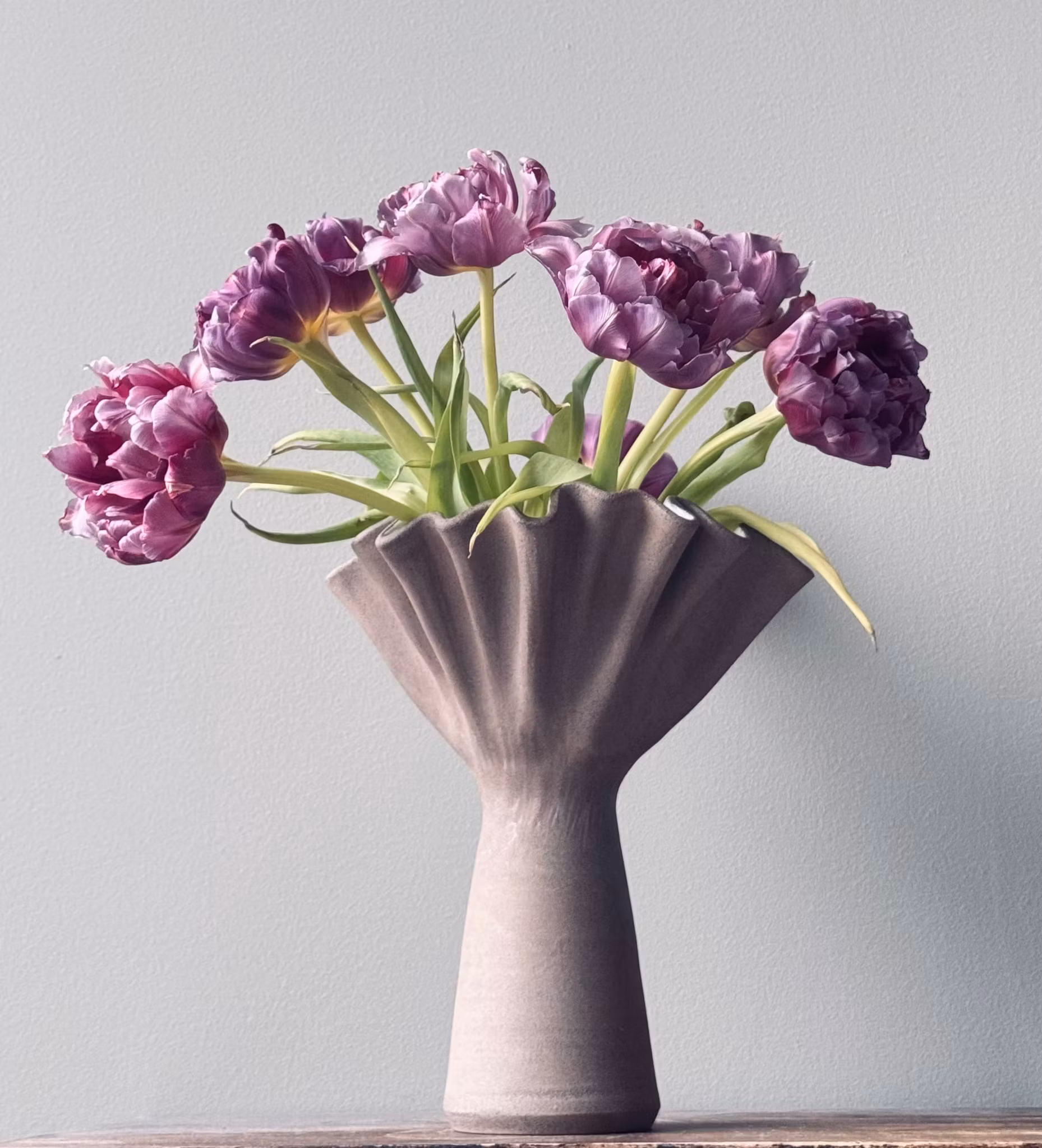 Stor vas på fot med veckad topp. Vasen är handgjord av stengodslera med glaserad vit insida. Då vaserna är handgjorda förekommer olikheter.