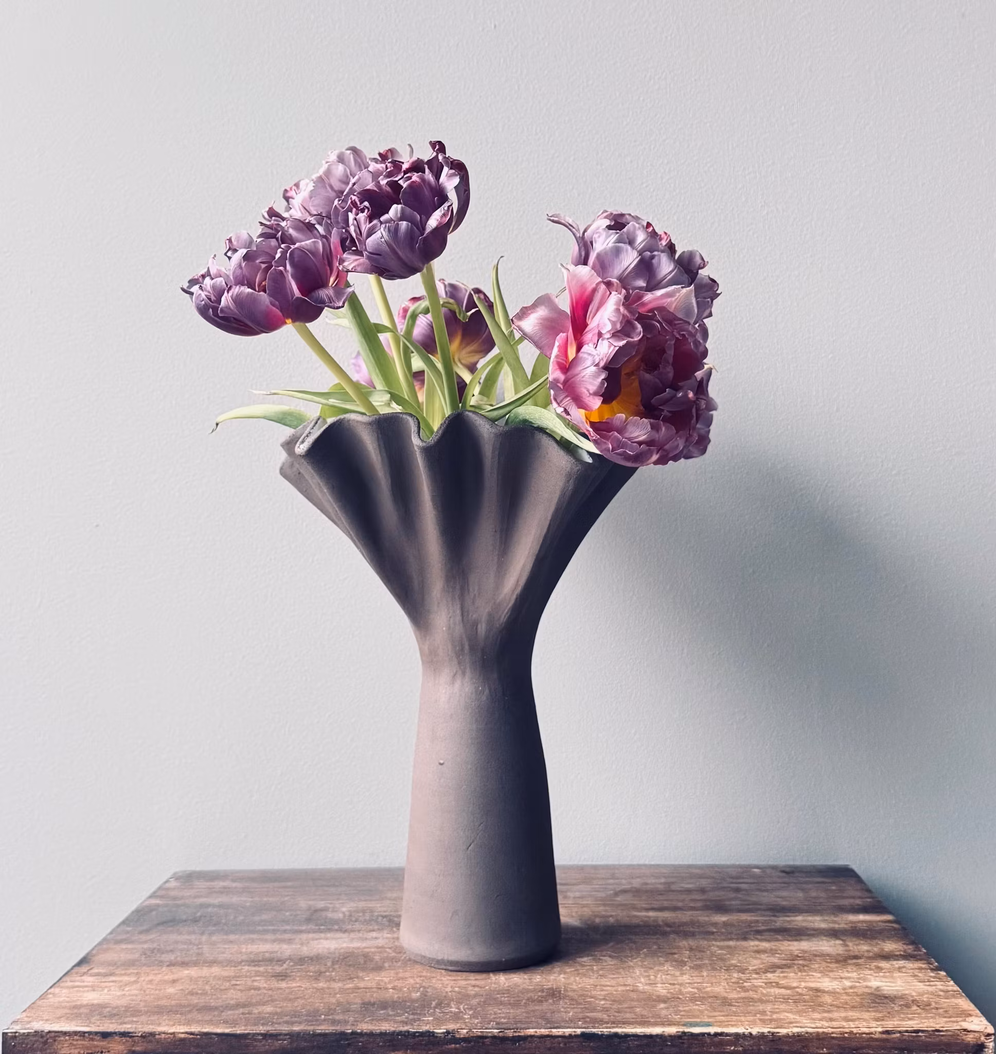 Stor vas på fot med veckad topp. Vasen är handgjord av stengodslera med glaserad vit insida. Då vaserna är handgjorda förekommer olikheter.