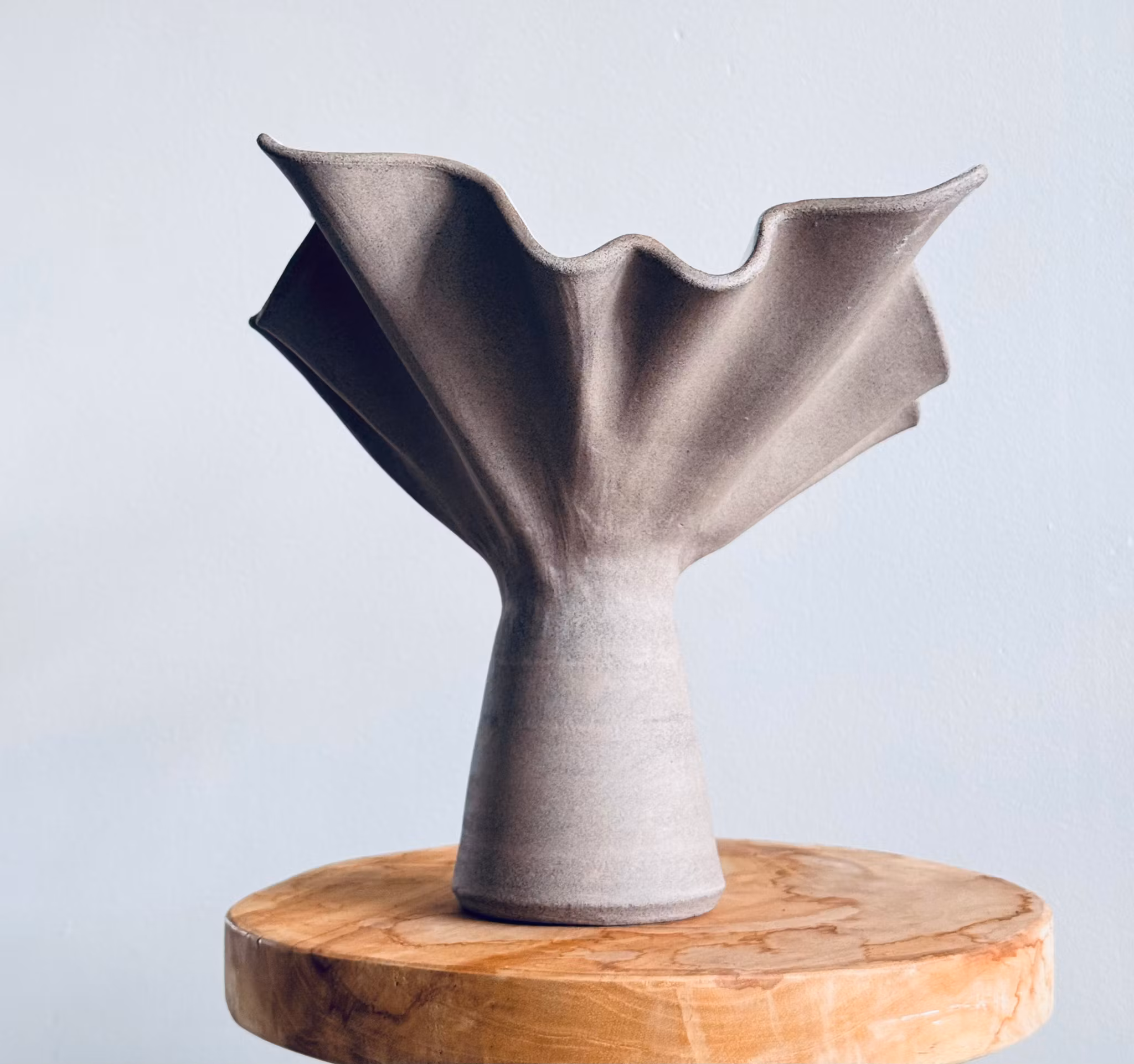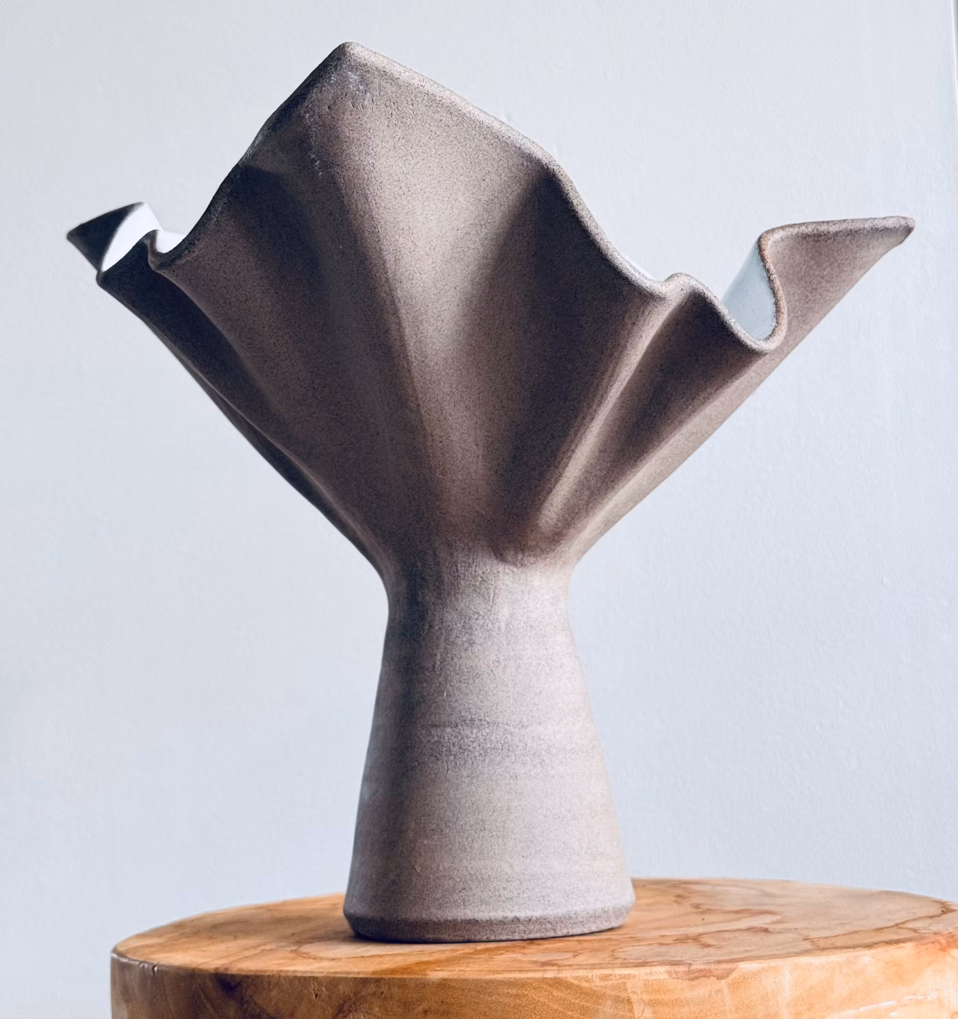 Stor vas på fot med veckad topp. Vasen är handgjord av stengodslera med glaserad vit insida. Då vaserna är handgjorda förekommer olikheter.