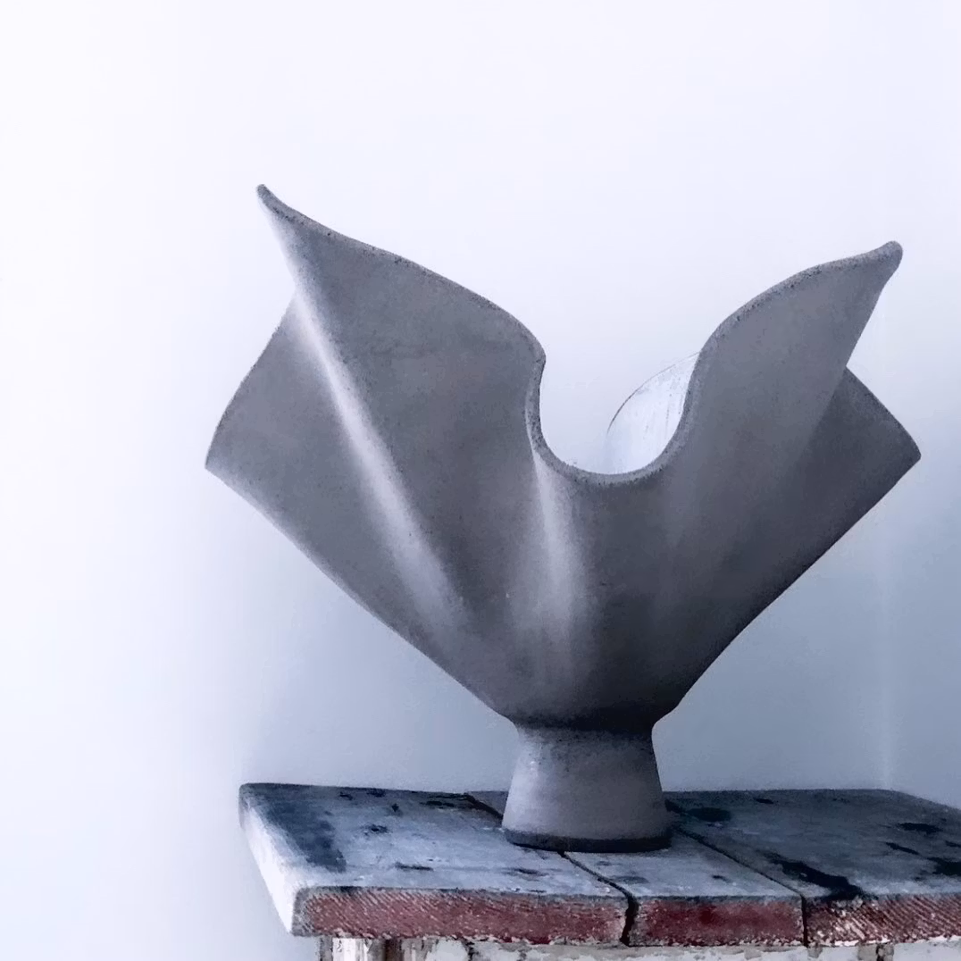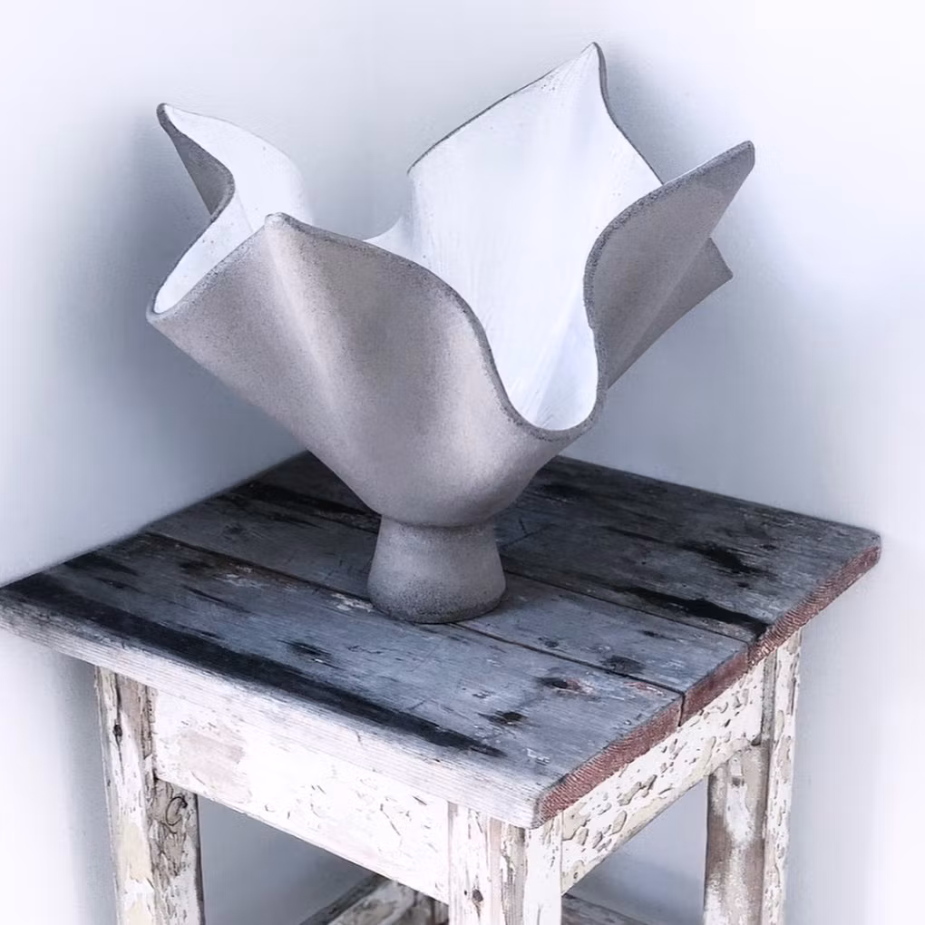 Stor vas på fot med veckad topp. Vasen är handgjord av stengodslera med glaserad vit insida. Då vaserna är handgjorda förekommer olikheter.